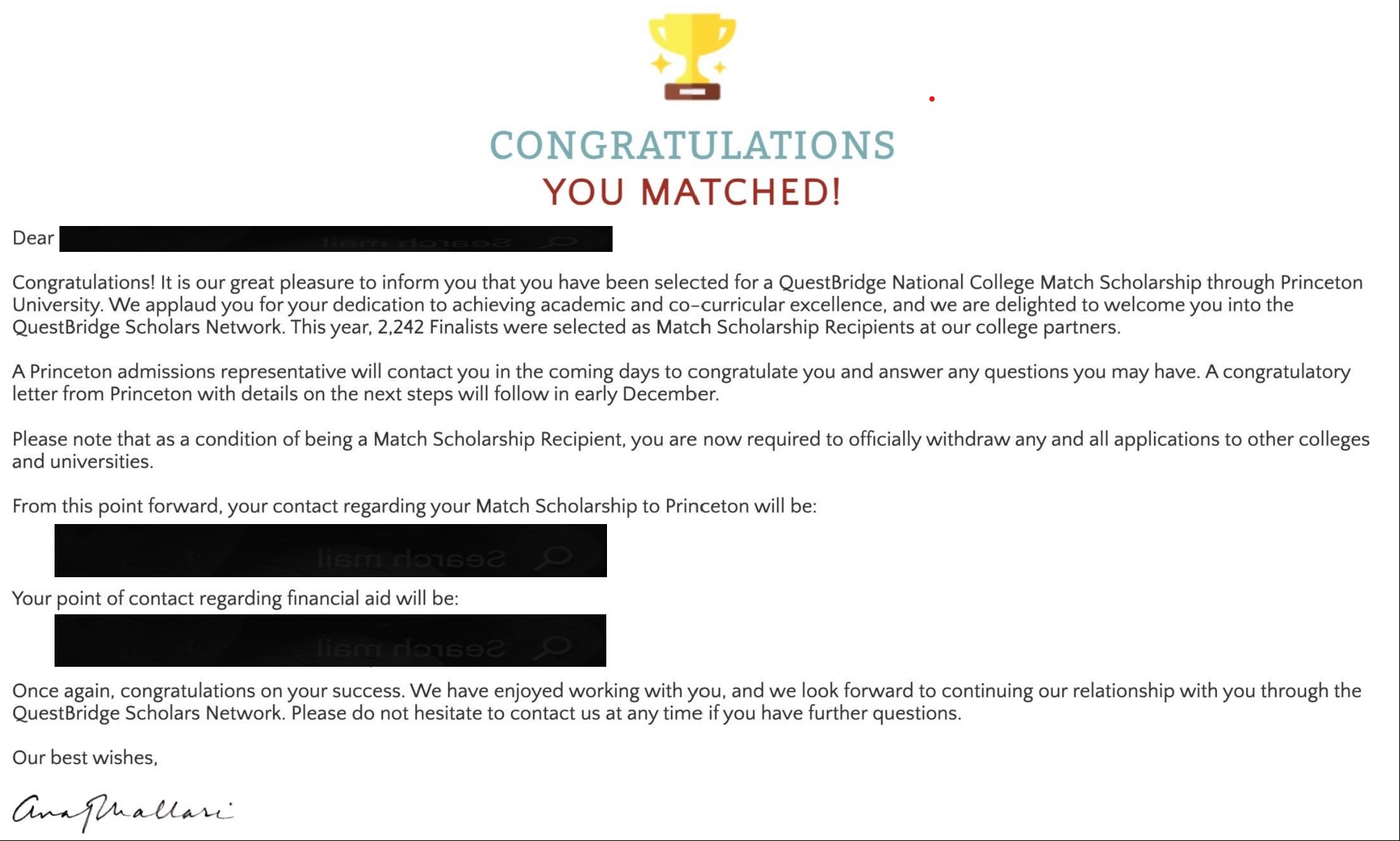 With our advice, this senior became a QuestBridge National College Finalist in October 2023. After ranking their top choices and submitting supplemental materials for their ranked schools, this student received news of receiving a QuestBridge National College Match full tuition scholarship in December 2023. What a joy it was to receive a phone call from this client the day they heard the news to thank us and say the result would not have been possible without all our expert advice!