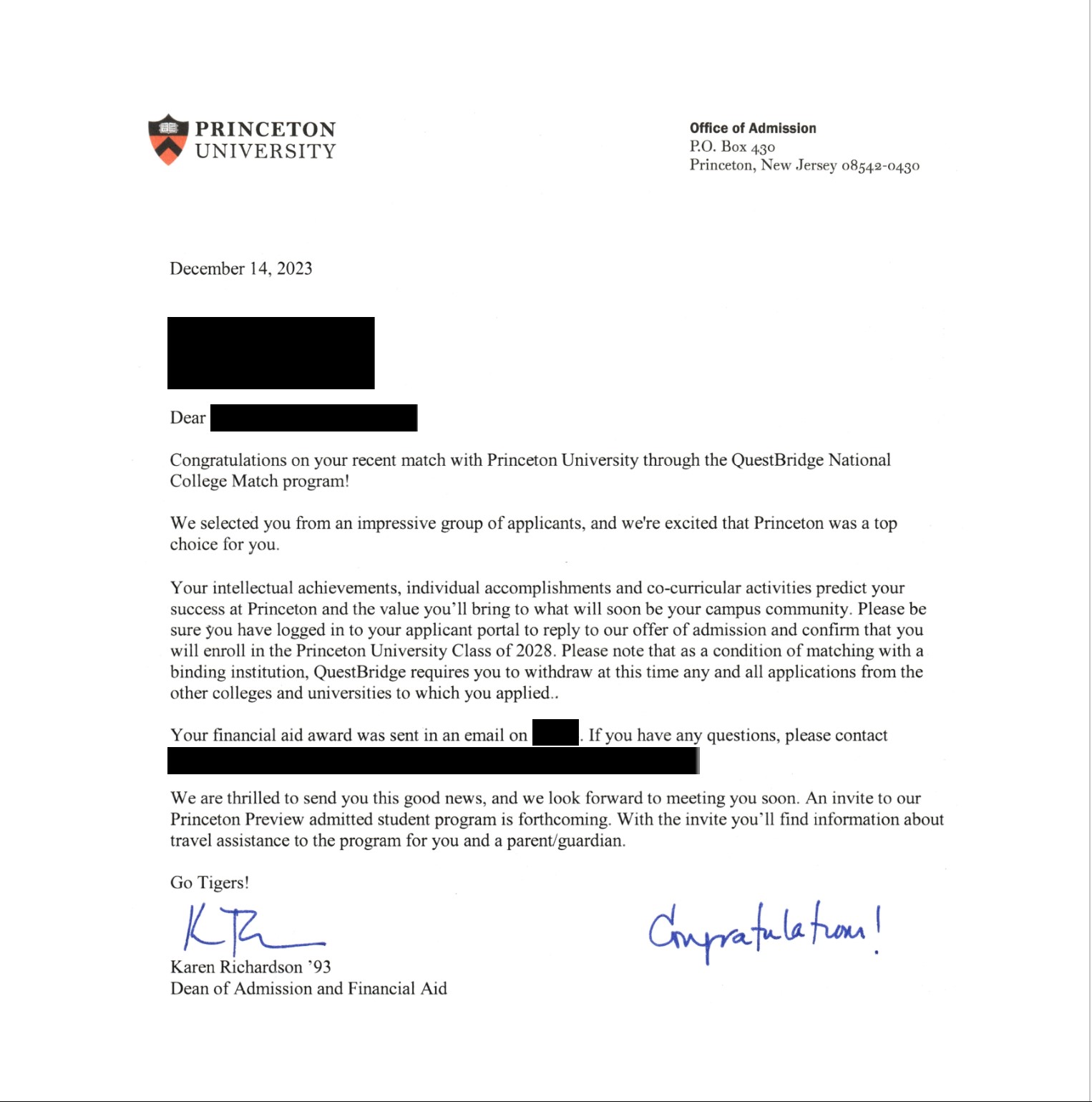Renaissance Admissions Consulting is delighted to announce the amazing news of a client receiving binding acceptance to Princeton University for the Class of 2028 with a four-year full tuition scholarship! In addition to tuition, the scholarship will cover housing, food, books, supplies, and travel expenses. Princeton typically enrolls between 1350 and 1500 students to enter their freshman class.